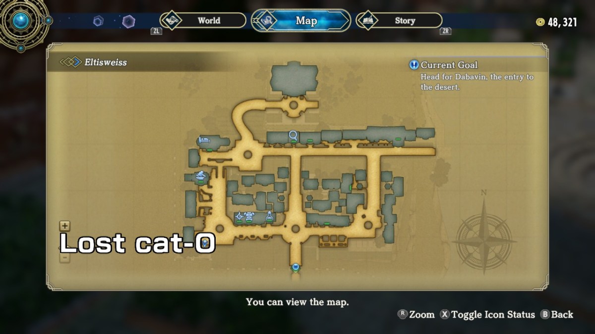 Isha will ask you to find a missing cat. It’s still in Eltisweiss, so need to worry about leaving. Head to the fountain at the southwest corner of town. In the corner is the last cat, Yam. Talk to it, then head back to Isha.