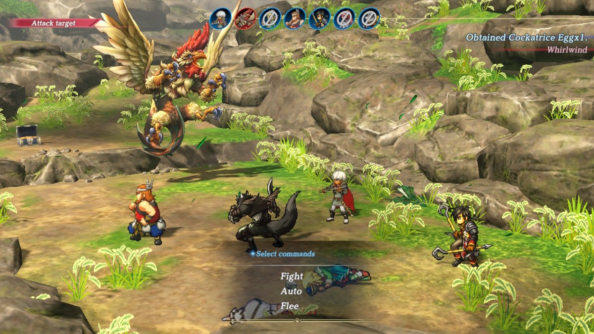 Now, you aren’t looking for a treasure chest and don’t need to try and endlessly battle the Cockatrice (hatchling) enemies to get an egg to drop in Eiyuden Chronicle. Rather, you need to wander around the Mountain Path Homeward area until a random battle against a Cockatrice (adult) happens. When it does, there will be a treasure chest gimmick. You need to have one of your allies open that chest before the fight ends to get the egg.