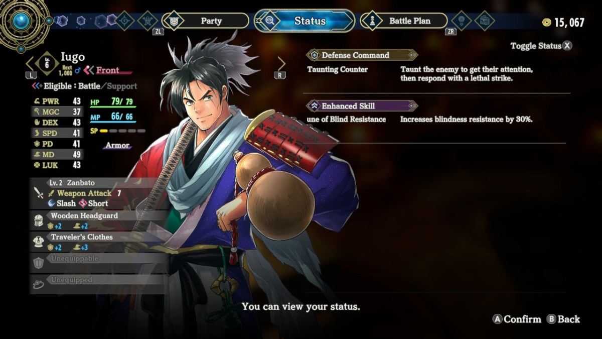 I love how Iugo looks. I think his Taunting Counter defense is really neat. But I never really used him! When he joined my party at level 6, he was over 10 levels behind everyone else. Also, his equipped Rune-Lens only increases his blindness resistance by 30%, which isn’t a huge help. He’s a cool guy, but I think there are better warriors out there for your crew.