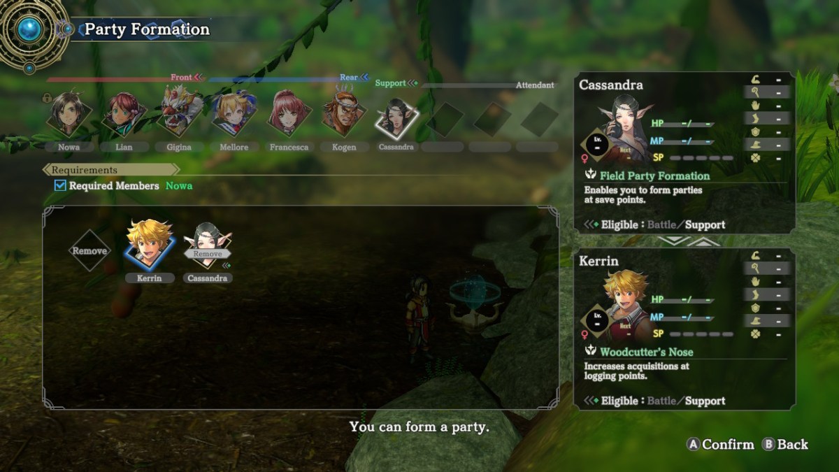 However, Kerrin isn’t handy as your party’s optional support. You only get more lumber and materials at logging points with the character in the party. I recommend keeping Cassandra around initially instead, since that lets you access the Party Formation screen at any save point.