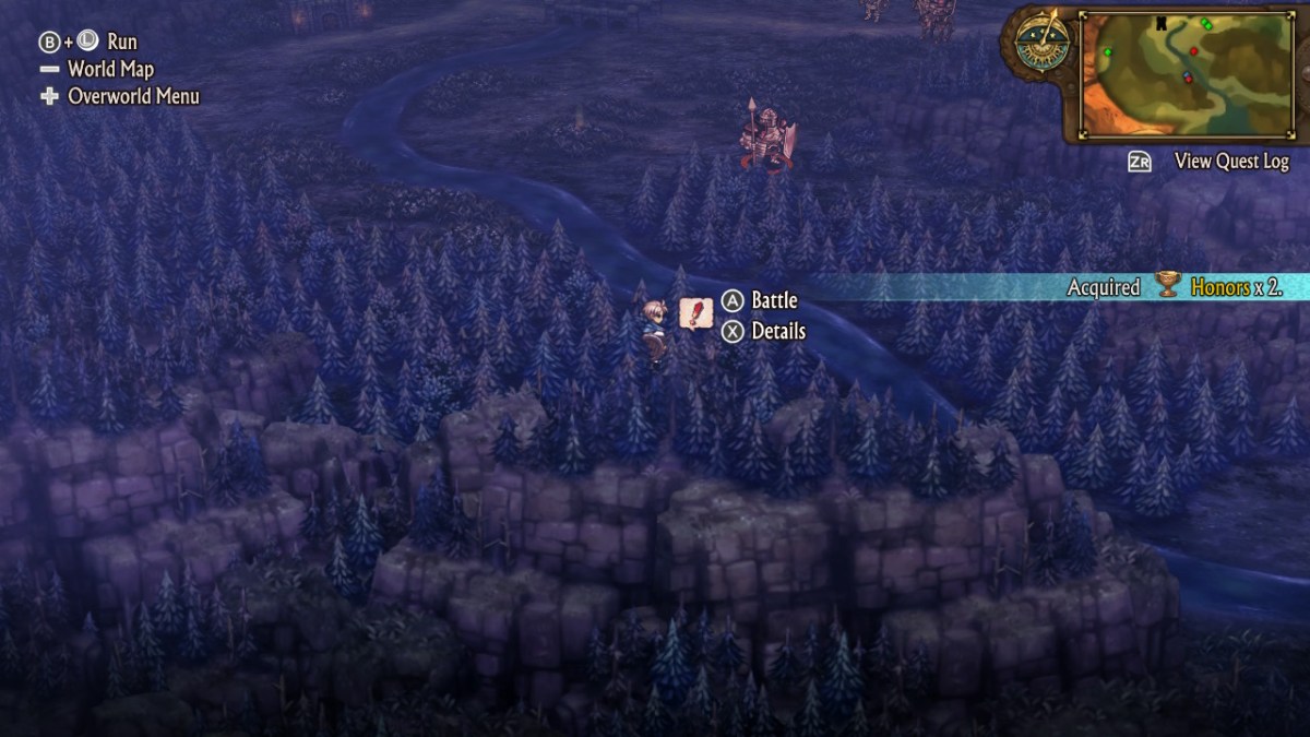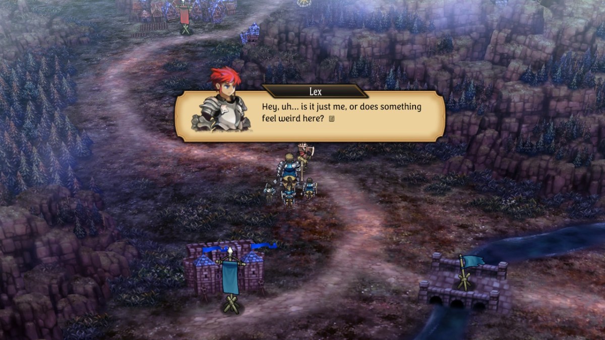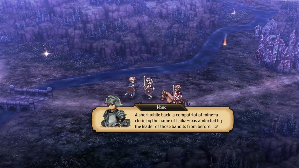 Now, from there you’ll see an overworld segment. You’ll be able to talk to Monica and Hans there. Now, if you want to continue this and actually get a chance to recruit Monica, you need to speak to Hans again. He’ll tell you the bandits crossed the bridge to the south and headed into the forest. When he does, Vanillaware actually has the camera pan to show you where you should go. There is no city or camp, and there’s still no “battle” icon on the field. However, walk south into the forest.