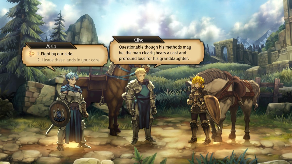 The battle won, you’ll get the chance to recruit Monica or leave her to remain caring for the land. I recommend recruiting her, because it never hurts to have another character who is on horseback and she has Rapport conversations with Clive. You also get a White Knight’s Shield with the Lifeshare ability for winning.