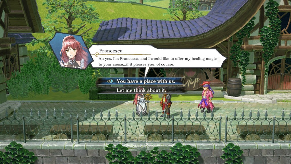 In Altverden, Francesca will join right away, but Kuroto says he’ll only join you after you prove yourself by defeating five wild boars at Redthroat Ridge. Kuroto is in the southwest part of the village in front of his home. Talking to him will let you take his request. Head to the northwest part of town, and you’ll overhear an argument. That’s where you’ll find the healer Francesca being accosted. Once you talk with her, you have the option of recruiting her immediately, which I recommend.