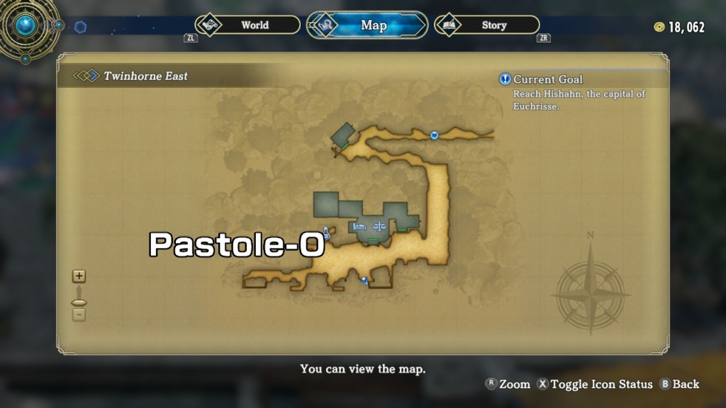 Once you can reach the Euchrisse region and are heading toward Hishahn, you can stop in Twinhorne East on the way. Walk past where Mariette was and head west until you’re in front of the town’s Tool Shop. You’ll see a man in green there. That’s Pastole.