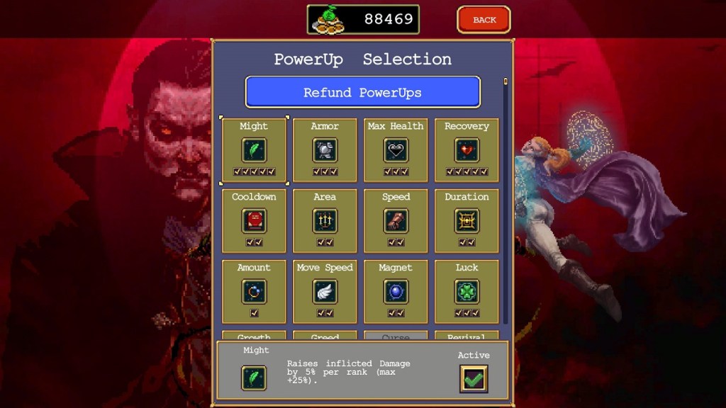 How do I refund my power-ups in Vampire Survivors?