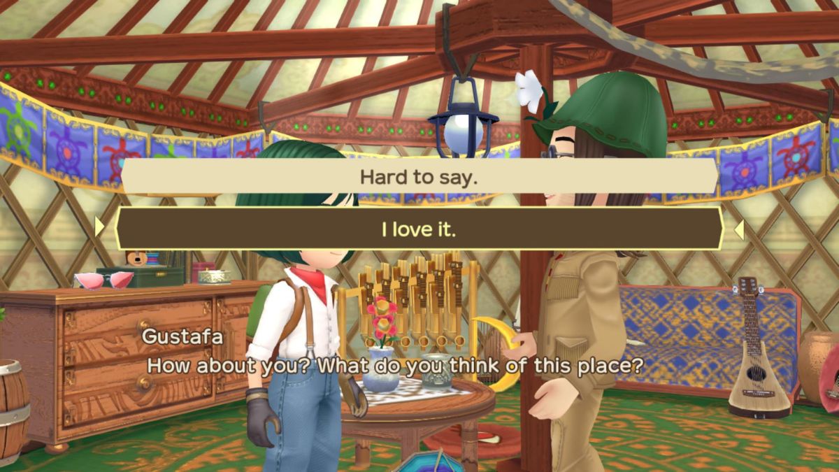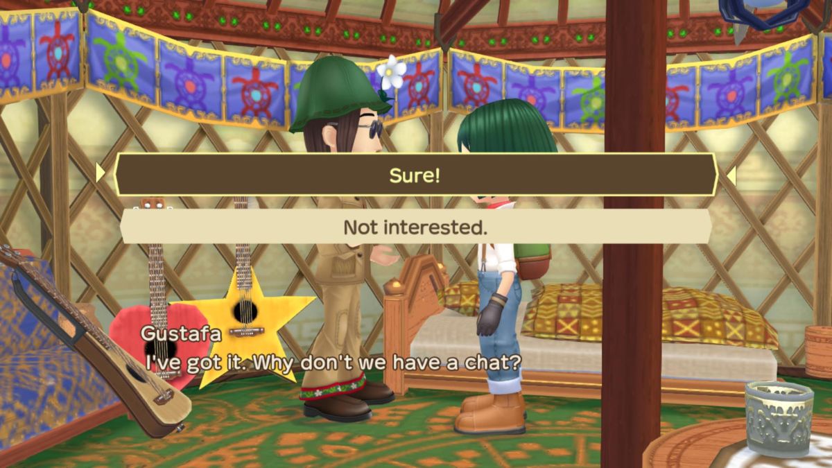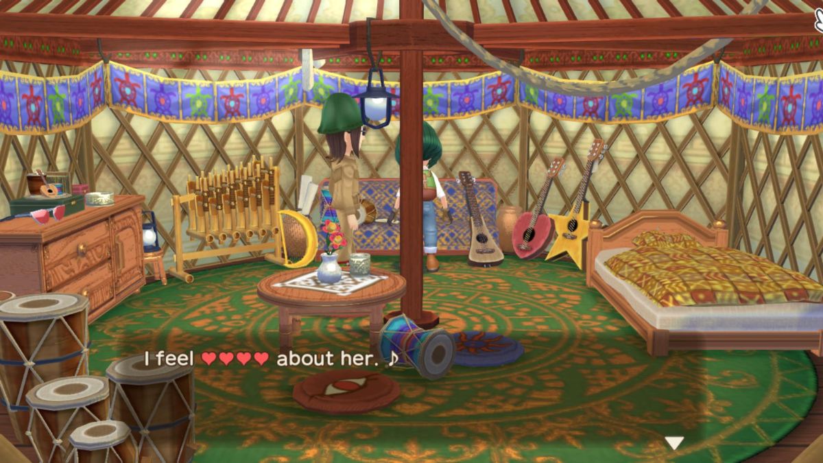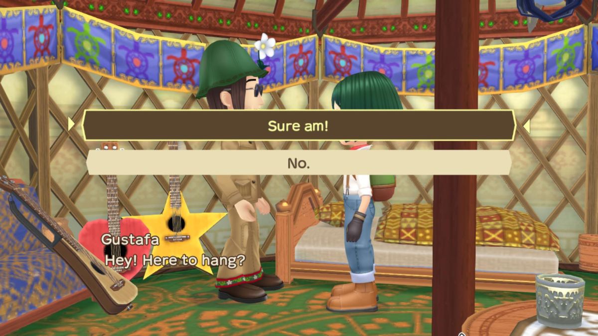 To check how much Gustafa likes you in Story of Seasons: A Wonderful Life, enter his Yurt around 9 AM before he leaves for the day. His diary is between the seat cushions of the couch to the left of his bed. How many hearts are displayed here indicates Gustafa’s feelings toward you. Once you see five hearts in his diary (or eight hearts on the Resident Info page of your journal), you will have successfully romanced Gustafa and he’ll accept your proposal with a Blue Feather. When you’re engaged, you must wait until the end of the first year to get married and start your family together.