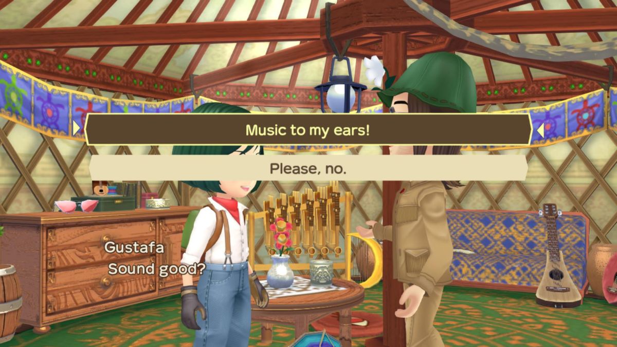 In the Summer, visit Gustafa in his yurt between 9 AM and 10 AM. He will ask if you want to spend time and chat with him before asking how you feel about Forgotten Valley and playing you a song.
