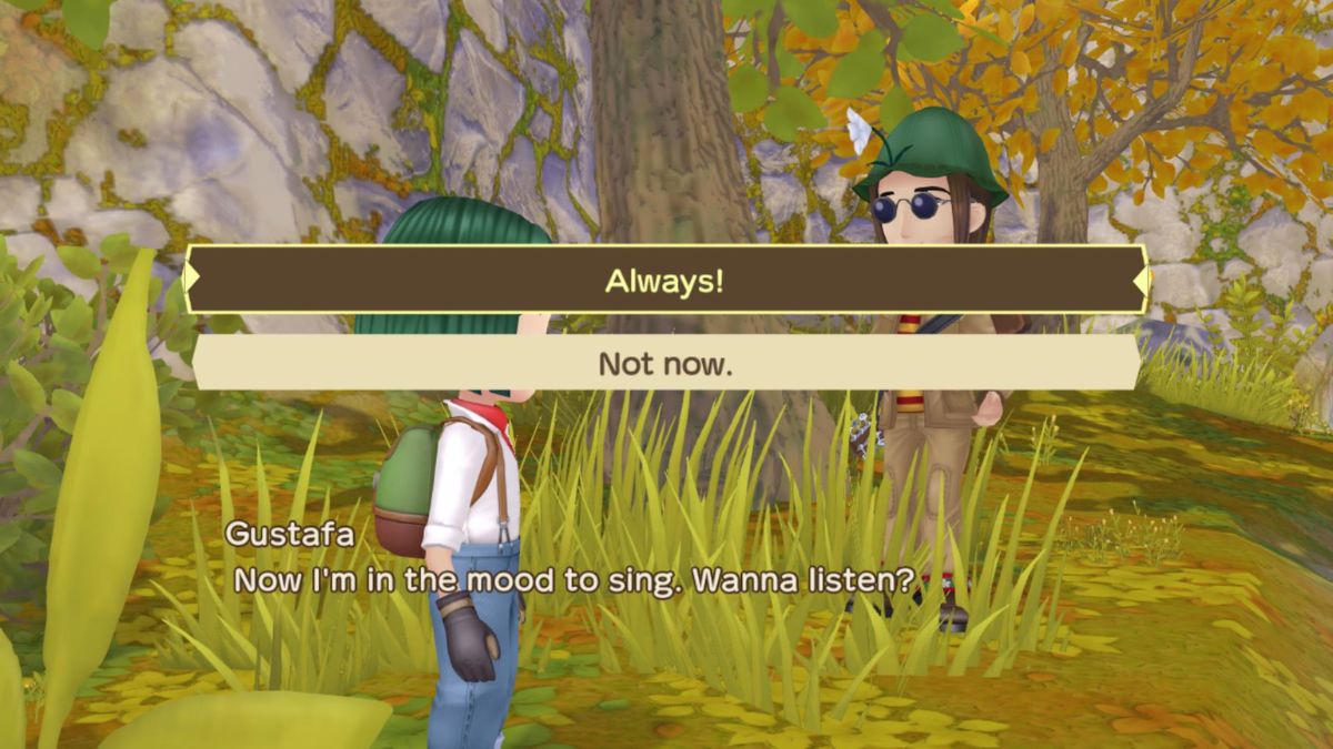 - Choose “Always!” when he asks if you want to listen to him sing. He’ll thank you for accompanying him by gifting you a Mist Moon Flower.