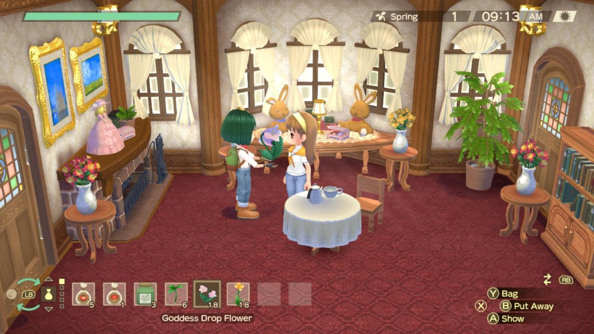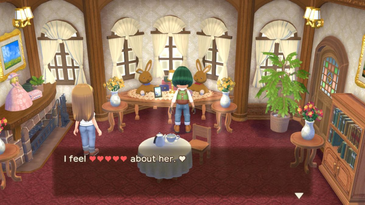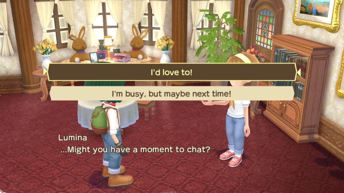 To check how much Lumina likes you in Story of Seasons: A Wonderful Life, head to her room in the Villa between 7 AM – 9:30 AM or after 8 PM. Interact with the table with the stuffed animals and jewelry box on to read her diary.