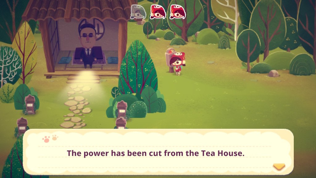 Okay, final step! You need to get the artifact to force the agents to leave. Go to the box to the right of the teahouse. Choose to cut the power, then quickly run south. The agent will head over to restore power. Dash up to the table that person was guarding and grab the artifact. Doing so will finish this section and clear out the Village Gardens in Mineko’s Night Market so you can get flowers and cat hairballs.