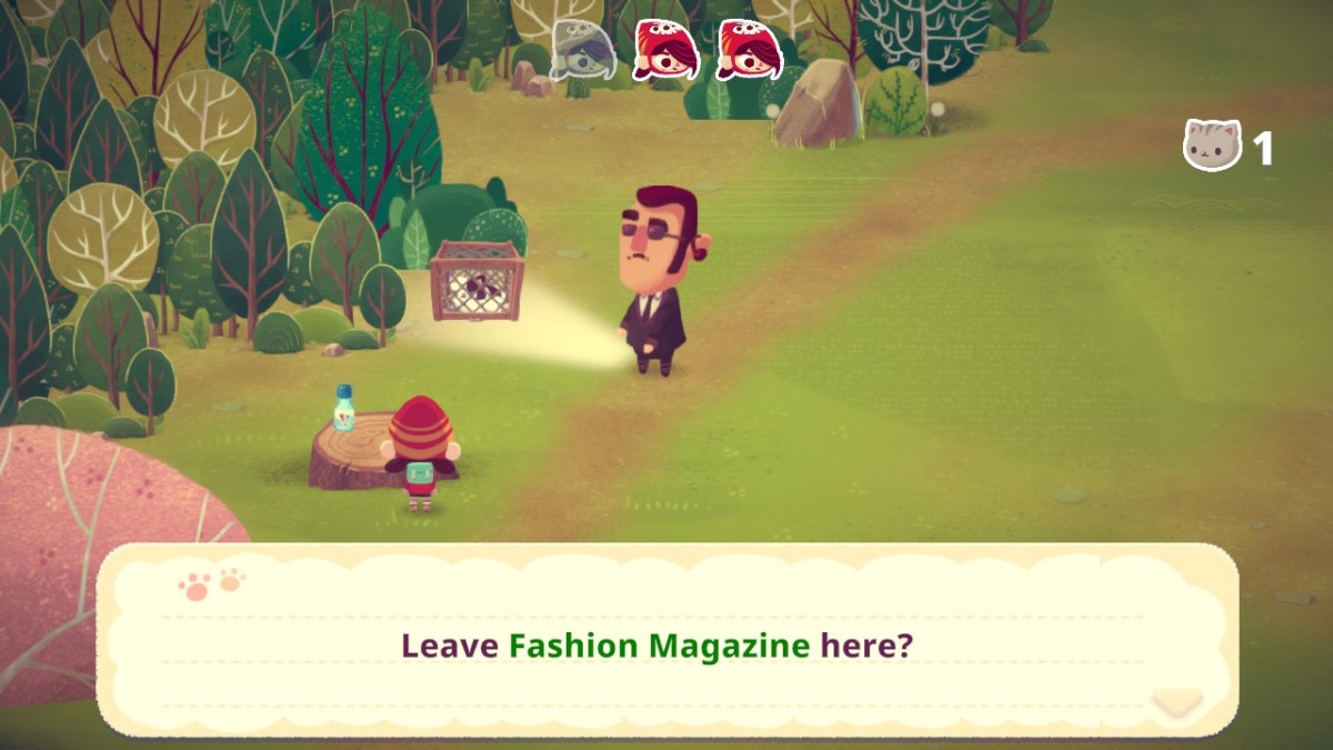 This last cat is one of the easiest ones to save. Remember that fashion magazine you grabbed earlier? Leave it on the tree stump with the ramune bottle on it. Run down a bit. The agent will go read it, letting you free the cat.