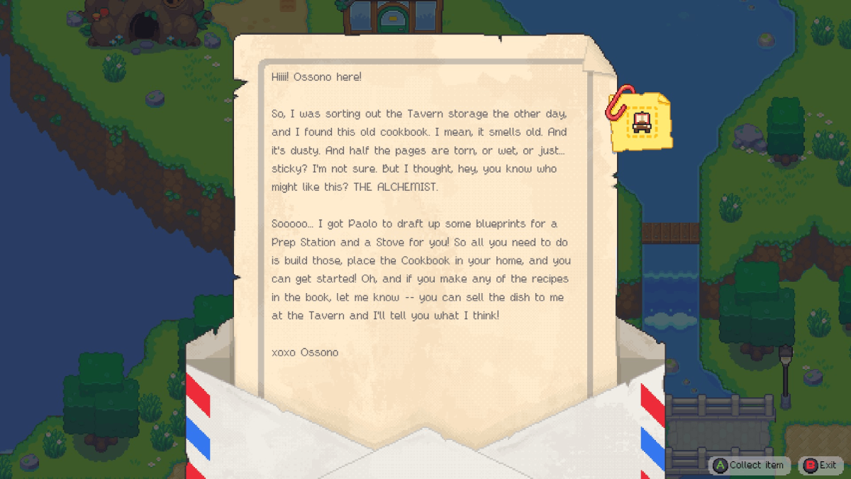 The Cookbook is an easy item to obtain in Moonstone Island, as it will be delivered directly to you. The appearance is random, but if you load up an existing save game, a letter from Ossono will arrive in a couple of days providing you with the Cookbook and the blueprints for the Prep Station and Stove.
