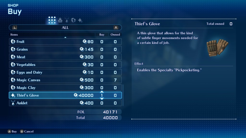 The Thief’s Glove is sold at the Harley item shop called The Sunken Vessel. You can head to Harley immediately after taking care of the events in Krosse, before going to Kurik. It’s the eastern port town past Marze. It will cost you 40,000 fol.