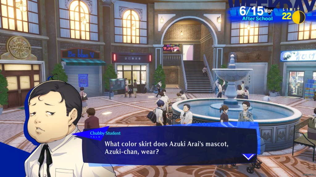 So when I started the Nozomi social link, it was in June and I had my Charm at Rank 3: Confident. I don’t know if you can talk to him at a lower Charm rate, as a result. But Charm is a prerequisite stat tied to talking to him. He’ll be at the Paulownia Mall, his regular spot, sitting on a bench in front of the fountain.
