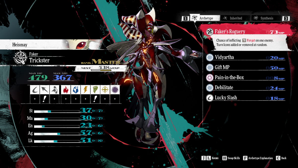 As mentioned earlier, Faker is a support Archetype that specializes in moves like Tarunda and Rakunda. These abilities weaken enemies to reduce how much damage you take, as well as increase how much damage they take. It might not be an Archetype you want to permanently keep a character in, but you can certainly benefit from learning Debilitate or Vidyartha.