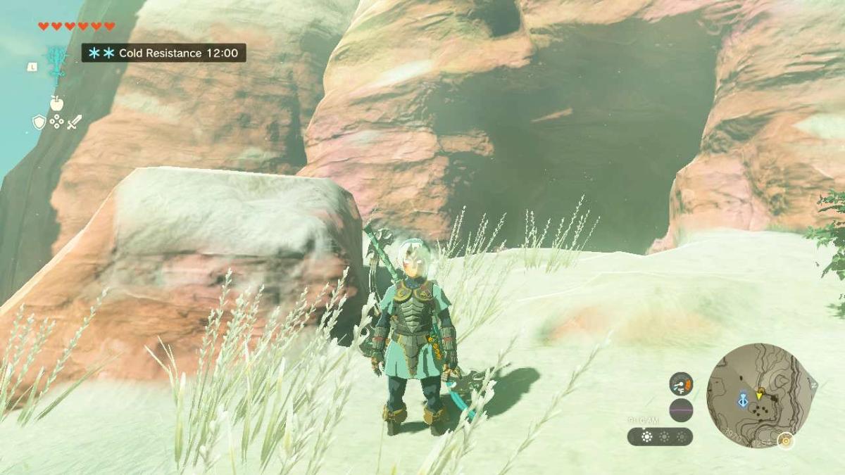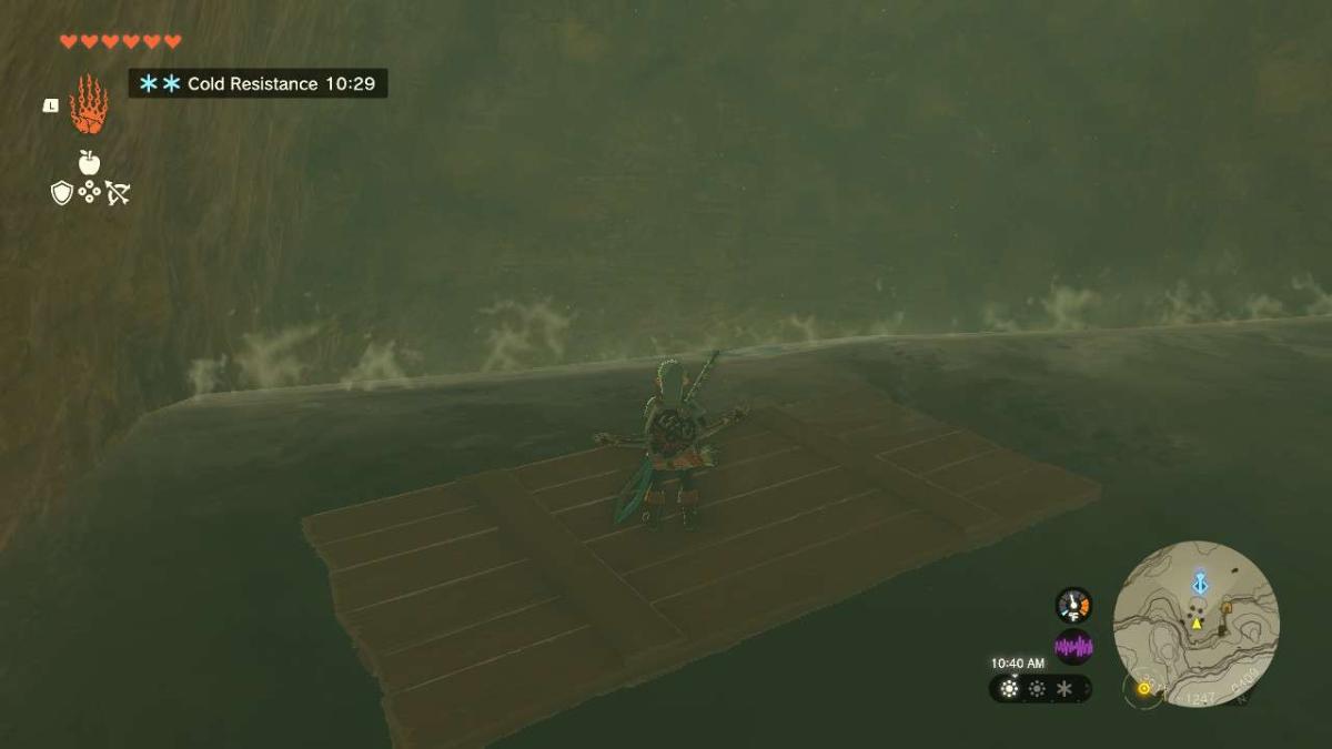 Before you progress, ensure you have Cold Resistance, either from armor or an Elixir. Otherwise, Link will slowly take damage over time due to the harsh weather conditions here. To get into the Skyview Tower and access the control terminal, head north from the main entrance and you’ll see a cave. Enter Meadela’s Mantle cave, and after a few steps, you’ll see some wooden boards by a river. Use Link’s Ultrahand ability to move one of the boards onto the water, then jump on them.