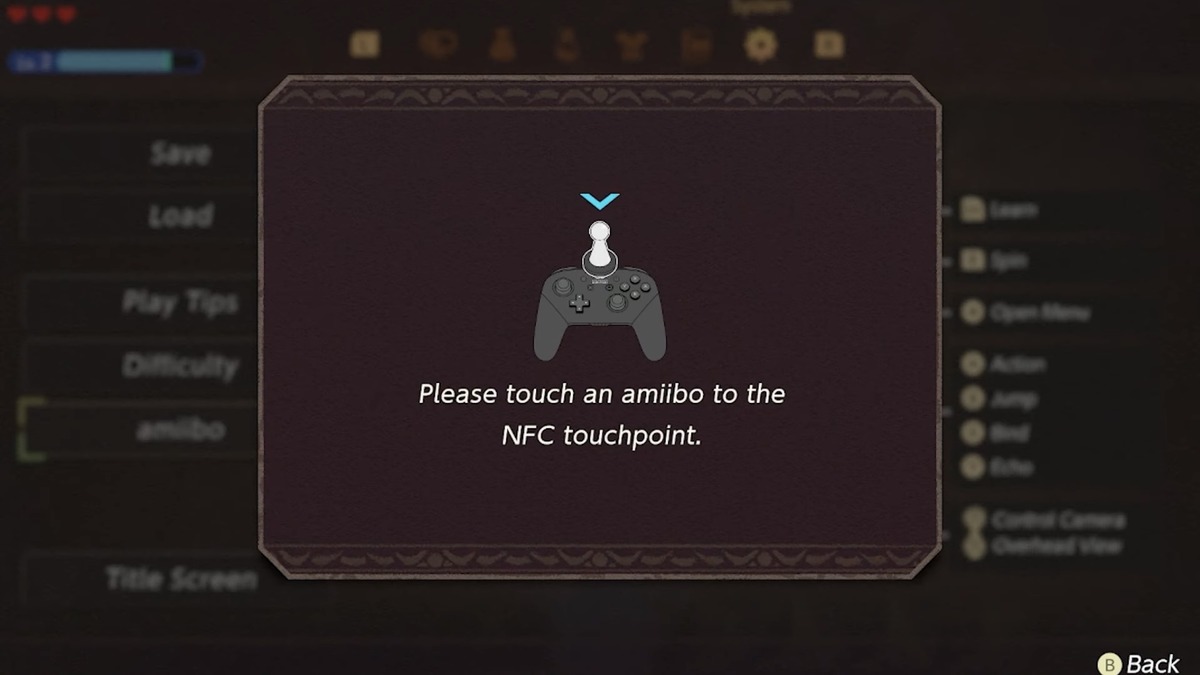 Using amiibo in this game is quite similar to its counterparts in Breath of the Wild and Tears of the Kingdom. Select “amiibo” and then scan the bottom of your amiibo onto your controller. You can use Joy-Cons or the Pro Controller; either will work for this scenario. Note that you are only able to scan three amiibos per day. However, you can get around this with changing the date on your Switch.
