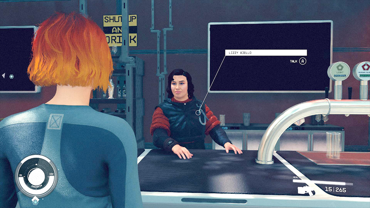 After you land on Gagarin, make your way to the bottom floor at the center of the colony to find the local bar. Once here, speak to the bartender named Lizzy Ajello and select the “I’m looking for work” dialogue option. The NPC will then ask you to retrieve luxury alcohol from a ship that is floating around the moon, Grissom. You will now have the Sure Bet mission active, which tasks you with finding the Bogdanov Boutique Liquor item.