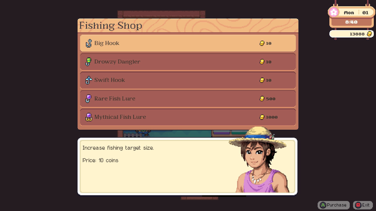 Tobin doesn’t just buy fish from you or sell you the Fishing Rod. He can also offer Lures that improve your fishing ability.