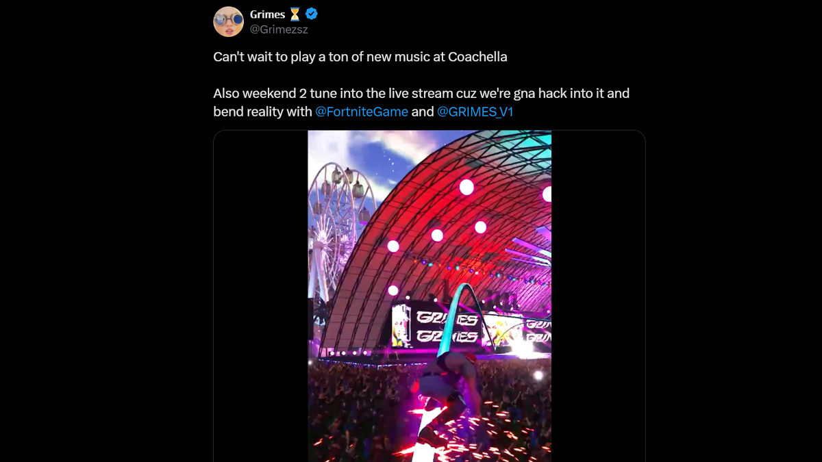 Based on the wording, it appears that Grimes will have some kind of tie-in with Fortnite during her second-week concert at Coachella. Interestingly, the award-winning artist also tagged her “AI” personality ‘GrimesV1’. So, it’s possible Fortnite players will get some kind of performance from the AI version of Grimes.