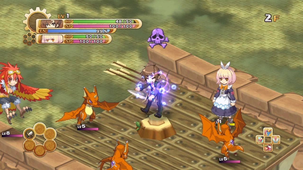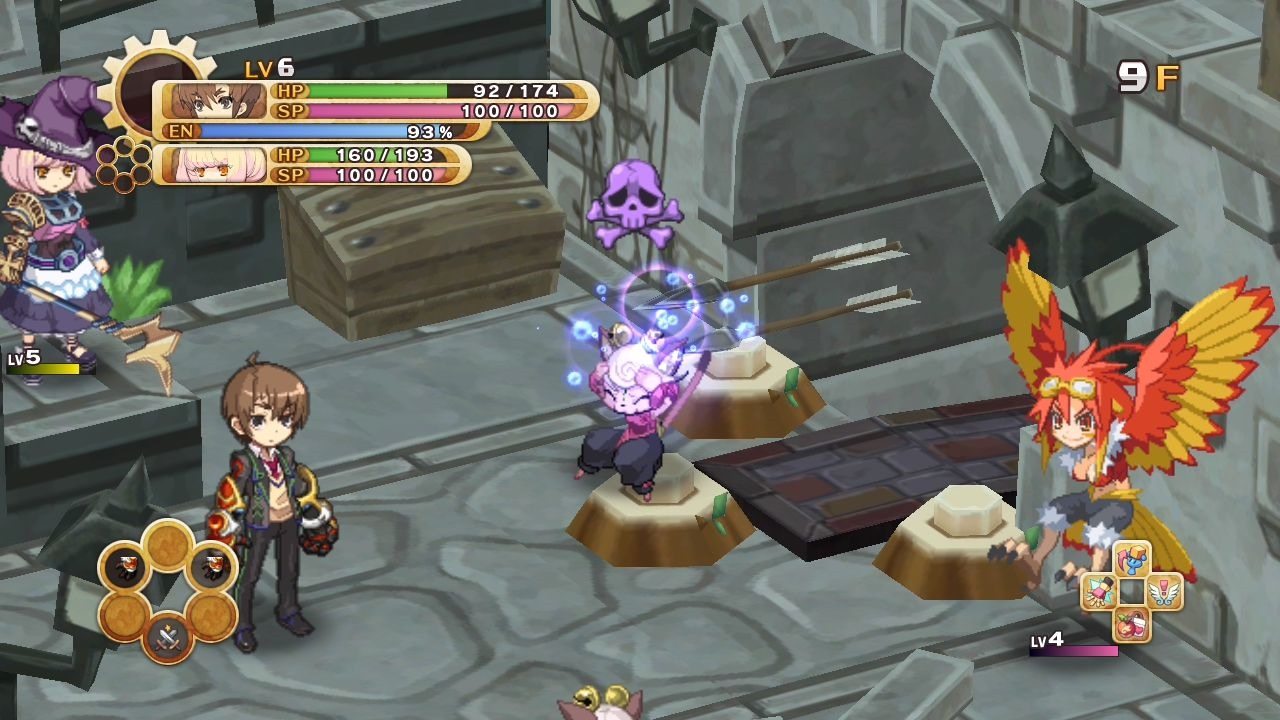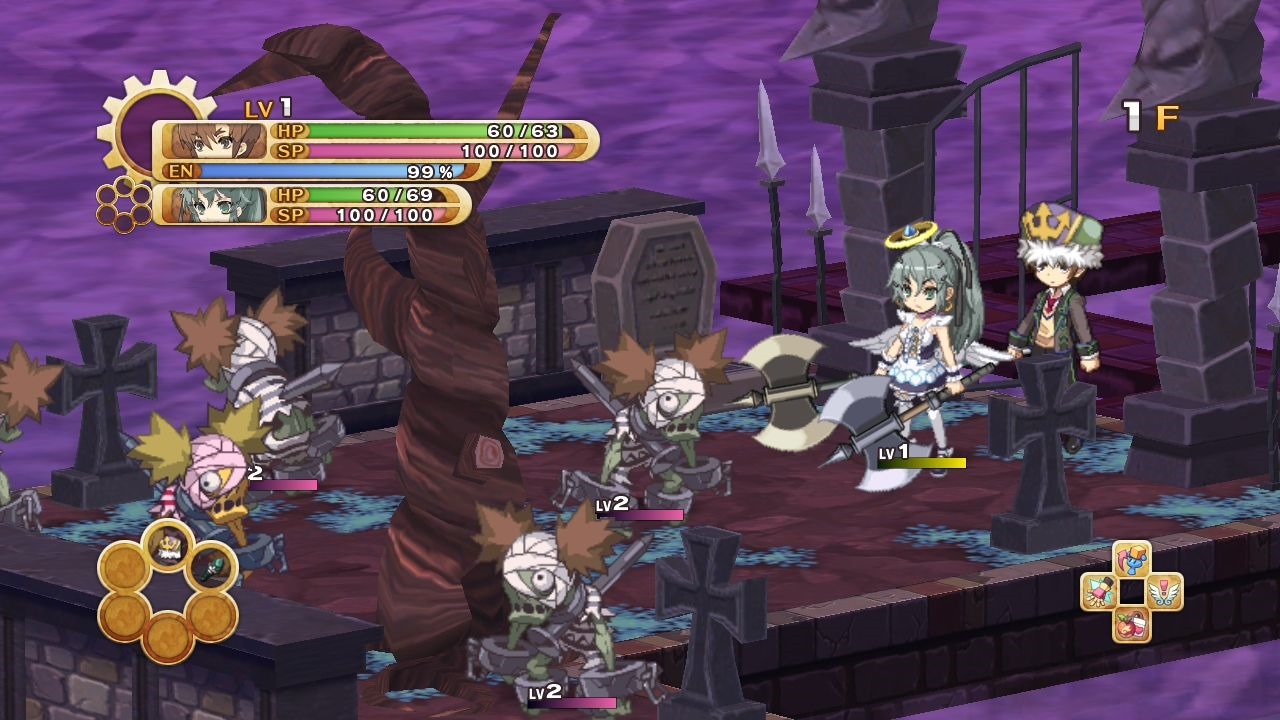 While you can get to level 9,999 in Disgaea, The God and Fate Revolution Paradox resets Renya back to level 1 when you leave a dungeon. Just like Z.H.P. Unlosing Ranger vs. Darkdeath Evilman, players can customize Renya by building Holy Circuits. You can place chips around sacred objects that boost attack, defense, hit, and speed parameters. Complete a whole circuit and you can even more of a bonus.
