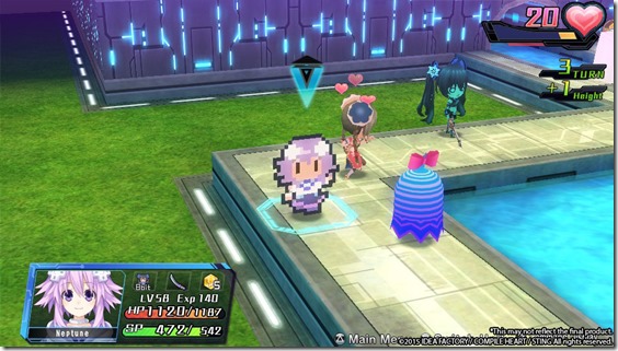 At first glance, an SRPG may seem like an odd choice for a spinoff to the Hyperdimension Neptunia franchise. Only at the first glance, though. Once you’ve spent some time with the game, a lot of the things at work in the battle system feel familiar in some sense, since the main series’ combat is entirely about positioning anyway. During party setup, you must pick a leader (who causes passive stat changes depending on who’s picked), as well as the remaining characters to fill in the slots allotted for the mission. After that, it’s very rudimentary stuff. You get to move everyone around, then the computer does, repeat. Of course, you have to deal with multiple elevations, which is handled by lifting and throwing boxes around to create stairs, or by simply jumping. Everyone has set jump heights you can alter with equipment, but floating characters (read: only the CPUs when in HDD and Lady Wac) can just ignore that and go anywhere the map allows. Additionally, there are things like steep falls, damaging traps, and other things of that nature that prematurely end any attempted movement unless you’re floating… or if you’re an enemy character. Yes, even grounded enemy characters are completely unaffected by pit traps and the sort, with no explanation given. As for how the rest of your characters can avoid these, you have limited control over your movement path. Every character attempts the simplest L-shape starting by going in the direction they’re currently looking. You can manually turn them around before moving, but that’s the full extent of your control. Furthermore, there are treasure chests (and, depending on the map, other things like switches) scattered about. These only respond to normal attacks, and must be attacked in all cases where they exist if you want to interact with them. There are some elemental treasure chests around that only open if you attack with the element the chest is weak to.