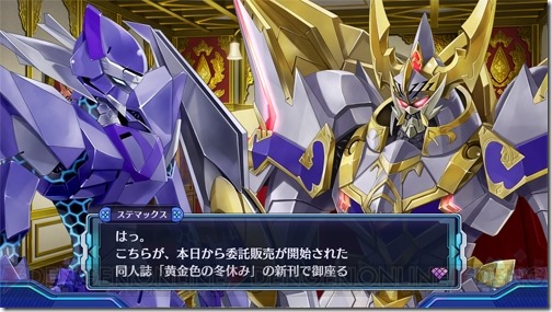 To the left on the next image is Stemax. The two characters appear in Hyperdimension Neptunia Victory II as rivals of Neptune and the other CPUs. With their bulky armor, they look like they’ll be worthy rivals to Neptune and friends, but they’re actually big otaku, and will often talk about things in depth.