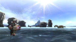 One of the missions in the Monster Hunter 3 demo was to crush a giant sea serpent. I chose this as my mission and walked up to the appropriate zone on the map to dive into the water. Oh, like Monster Hunter Freedom 1 & 2 there is a fair amount of loading time between zones. Granted, this is just a demo and this could be fixed later on. Once you’re submerged you can dive further by pressing the B button on the remote. If you want to surface you also press the B button, but you point the remote to the ceiling. Hunters don’t have an infinite air supply underwater. You have to find and touch bubbles to breathe. If your air meter runs out you’re in trouble, but at least in the demo air was plentiful.