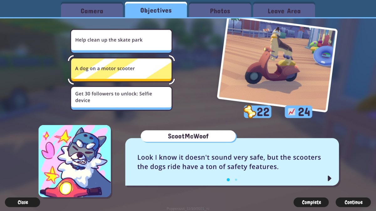 Pupperazzi is, as the name suggests, a game about taking pictures of dogs. Everything you do is in the name of that goal. Getting new camera equipment. Sharing pictures. Taking care of simple tasks like cleaning up a skate park. It’s all about those canines. You can go to five places at different times of days to snap those pictures. Fulfill requests. Make a name for yourself. Maybe even pet all of the dogs. As you gain followers, you earn the ability to do things like take selfies, dress up dogs, buy different lenses, and collect extra varieties of film. You can also get access to different times of day.