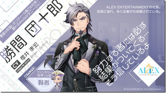 Square Enix is working on a “magical heart-throbbing fantasy x idol training game” called Idol Fantasy for smartphones, and today we got a first look at its rival idol group designed by Tetsuya Nomura. The three members of the group are Taiga Hashizume the redhead, Rei Suo with silver hair, and the black-haired Shion Ryuzaki. They are a rival unit called “LuCer” that jams out with cutting edge rock sounds with an overwhelmingly charismatic debut as a top-artist visual kei rock band. Their voice actors will be revealed on a later date. We also got a look at three characters who were designed by Square Enix character designer Roberto Ferrari, known for his work in sub-character designs for Final Fantasy XV and currently working as a character designer for Final Fantasy VII Remake. The three are staff members of ALEX Entertainment who are producers of idols, dance choreographers, and seniors with life advice: Danjuro Katsuma (CV: Takahiro Sakurai)