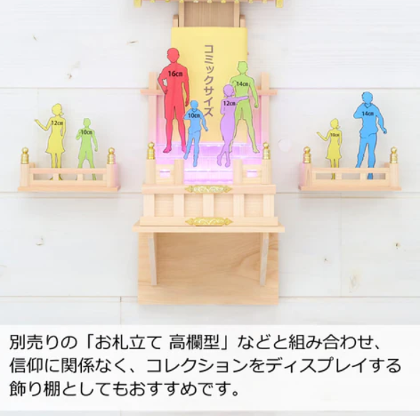 The altar uses real Japanese cypress in its construction. In Japan, Japanese cypress, or hinoki, is often the material that builders use for palaces, temples, shrines, baths, and traditional noh theaters. Because of the small size of the pulpit, the maximum size of your oshi should be around 16 centimeters tall. You can display figures, Nendoroids, acrylic stands, as well as multiple characters onto the podium depending on the size and type of merchandise you own.