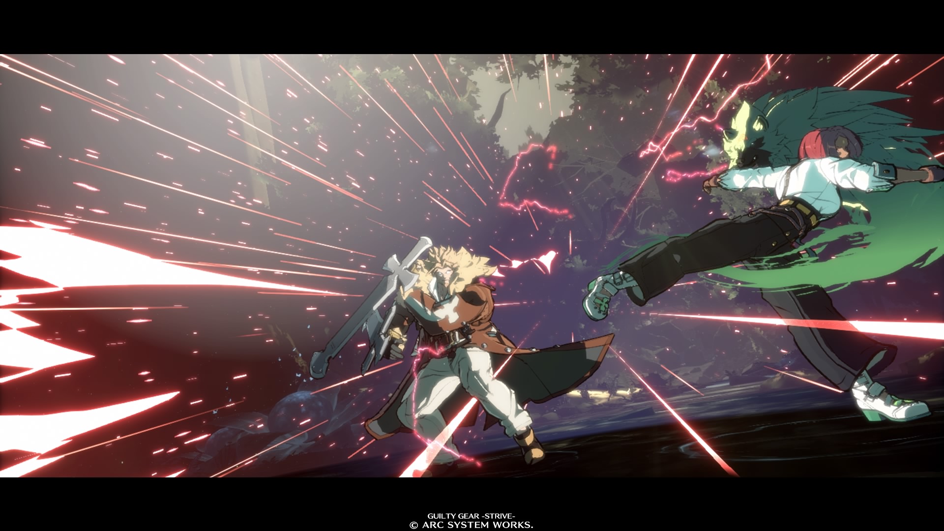 The return of the tension gauge and the abilities it enables encourages a faster paced game, since it charges when the player plays offensively and utilizes what the game sees as aggressive moves. High jumps, double jumps, and aerial dashes, all a cinch to execute, get the game off the ground and thrust dodging, distance management, and aesthetic into the spotlight of every match. There’s a playfulness to utilizing these techniques. Strategies, like baiting attacks, are introduced to the player intuitively without a need for explicit lessons. It’s refreshing to get into the mind game aspect of a fighting game this early on. It’s even more refreshing that most people I played against were also embracing that. The characters in Guilty Gear Strive are important to the atmosphere, too. The speed of the game and a few novel twists distinguish them from their archetypes. Leo Whitefang, for example, vaguely reminded me of Guile from Street Fighter at first, but I soon felt that theme song notwithstanding, Guile from Street Fighter is a boring version of Leo Whitefang.