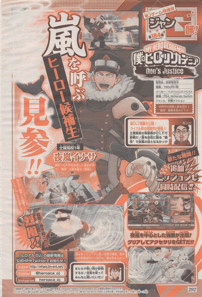 After a teaser last month, Bandai Namco made it official by revealing Inasa as the next playable character set to appear in My Hero One’s Justice as a new DLC character in this week’s issue of Jump magazine. [Thanks, @YonkouProd.] Inasa makes use of his “Whirlwind” Quirk to use the power of wind to control the distance between him and the opponent.Similar to the DLC character Endeavor, Inasa will come with his own missions when he becomes available to download. My Hero One’s Justice is available on PlayStation 4, Xbox One, Nintendo Switch, and PC.