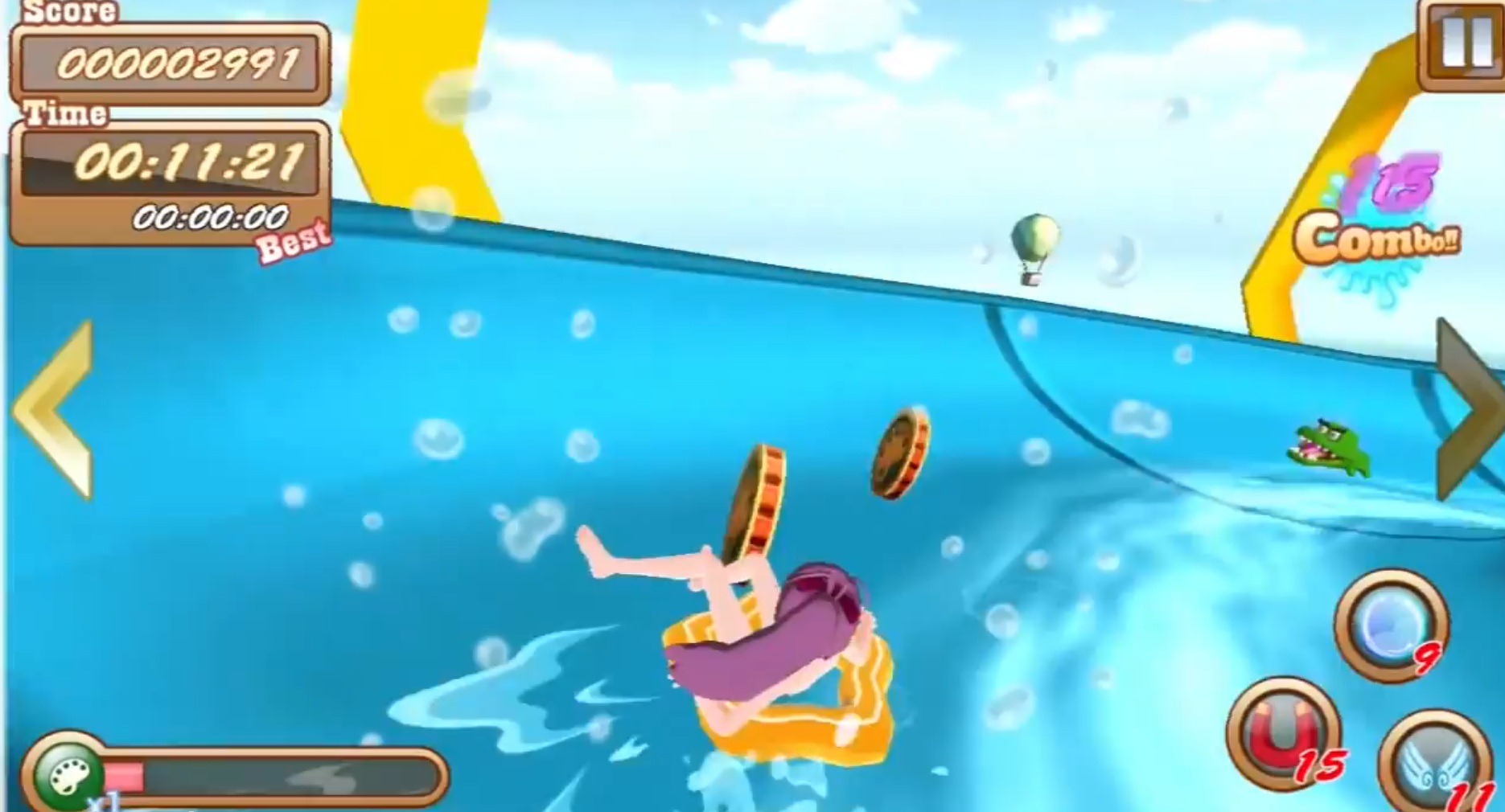 This year, the Tokyo Game Show had an indie section that quietly showed off some good stuff, and 4Gamer found a charming little waterpark-themed game slip-sliding into their hearts called Sliding Angel for iOS and Android. In the game, players pick from one of several ladies who have to race down a waterslide, picking up coins and avoiding obstacles such as octopi. Those coins can then be used to unlock more swimsuits for the girls to wear, new slide toys – ranging from rubber duckies to plastic sharks – and powerup items including a coin-attracting magnet power. You can also use real money to unlock them faster if you prefer. There’s also a mini-game where players have to tap the screen at just the right moment to snap pictures of their lovely lasses. For a indie, smartphone game, it looks very well put together.