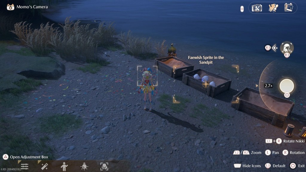 You will now want to head to the other side of the lake. All you need to do is walk in a straight line across the beach. Just before the round platform where Palida is, you will see three sandpits on the right. Enter the photo mode and take a snapshot of the sandpit in the middle. When you take the photo, make sure it says “Faewish Sprite in the Sandpit” above, as this will indicate the object in question is in the frame. To finish the quest, return to Loya and show her the photo.