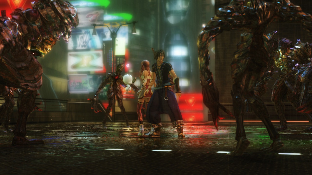 Monsters are the third party member in Final Fantasy XIII-2 and each creature has their own special attack called a Feral Link. Looks like the Tonberry is up to its old tricks with its lantern and little knife. Chocobos were in the last build of Final Fantasy XIII-2 I got to play and they have a kicking combo. Players will also see the flightless birds in Xanadu. The casino area has slot machines that look like futuristic bikes and chocobo racing where you can win a chocodagger.