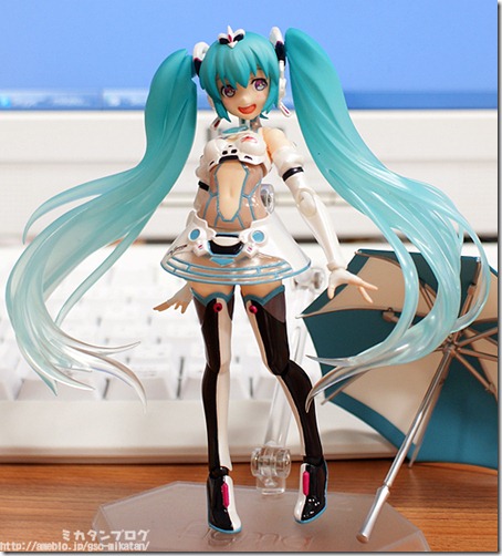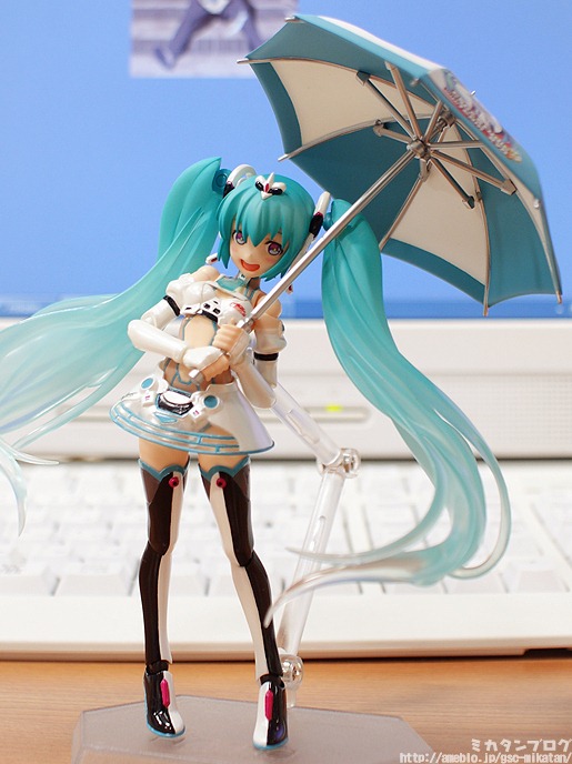 As indicated by the photographs, Racing Miku comes with an open parasol, a closed parasol, and a checkered flag as well. There’s a champagne bottle you make her hold on to as well. More images can be found at the links above.