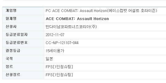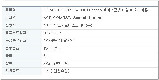 Is Ace Combat: Assault Horizon headed to PC? A rating filed by Namco Bandai in Korea suggests it is!   Ace Combat: Assault Horizon was released for the Xbox 360 and PlayStation 3 in 2011. Namco Bandai reported earlier this year that the game sold 1.07 million copies across the U.S., Japan and Europe. Assault Horizon has support for 8-on-8 online multiplayer dogfights, as well as an experience system for online modes.