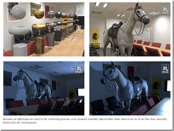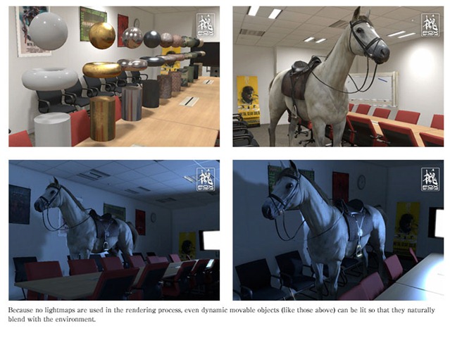 The correct answer is the set of the images on the right, which were created in Fox Engine. The ones on the left are real photographs. Kojima Productions explain that no lightmaps are used during the rendering process, so even dynamic movable objects like this horse can be made to blend in naturally: