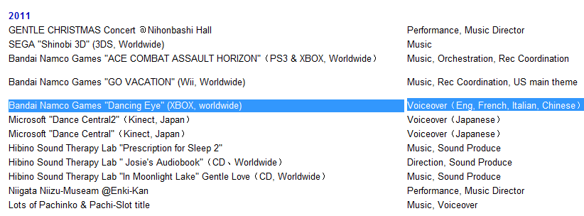 GEM Impact, an audio (and healthcare supplies) company that made music for Metal Gear Solid: Peace Walker and Bayonetta, says they worked on Dancing Eyes. Their projects page lists Go Vacation from Namco Bandai and Dancing Eyes as two titles they worked on. Specifically for Dancing Eyes, GEM Impact notes its a worldwide game and they recorded voiceovers in multiple languages.