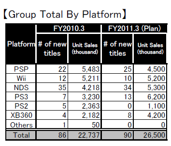 Take a look at this chart, it’s an outline of Namco Bandai’s publishing plans for each platform, In fiscal year 2011 (that’s April 2010 to March 31, 2011), Namco Bandai plans to publish thirteen PlayStation 3 titles, but only eight Xbox 360 games.