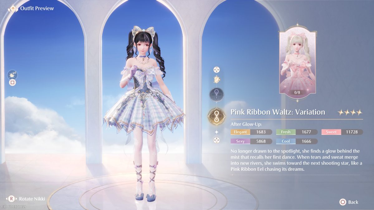 Pink Ribbon Waltz is a 4-star outfit, not a 5-star one, despite how it looks. What this effectively means is you won’t get the best stats from it, but some solid ones at the least. This particular banner event outfit focuses on the Sweet stat, in particular, with a little bit of love for the Sexy stat at the same time. It has S-level stats for Sweet, which isn’t quite up to par with the best SS-level Sweet clothing, but still great.