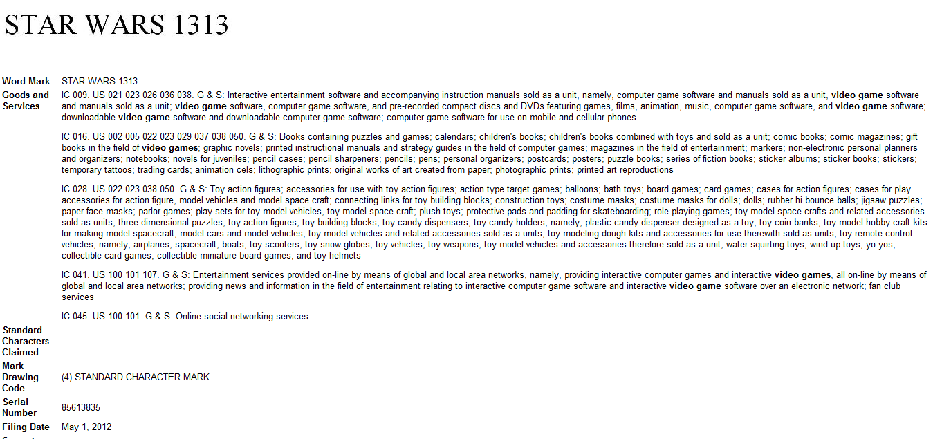On May 1, Lucasfilm filed a Star Wars 1313 trademark with the USPTO, which was released on the website late Saturday night. The trademark is for use with video game software, computer game software, books containing puzzles and games, action figures, on-line entertainment services for computer and video games, and online social network services.