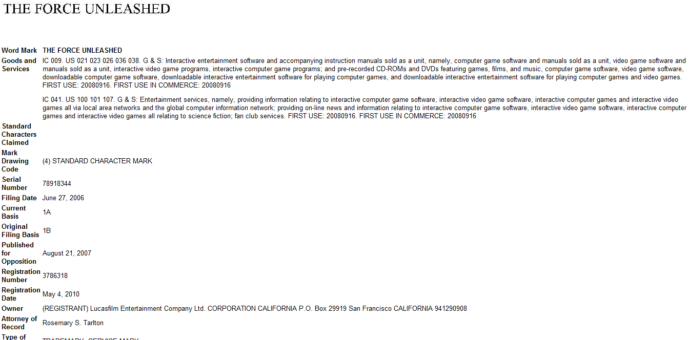 Lucasfilm filed a similar trademark back in 2006 for The Force Unleashed, which was developed into a video game.