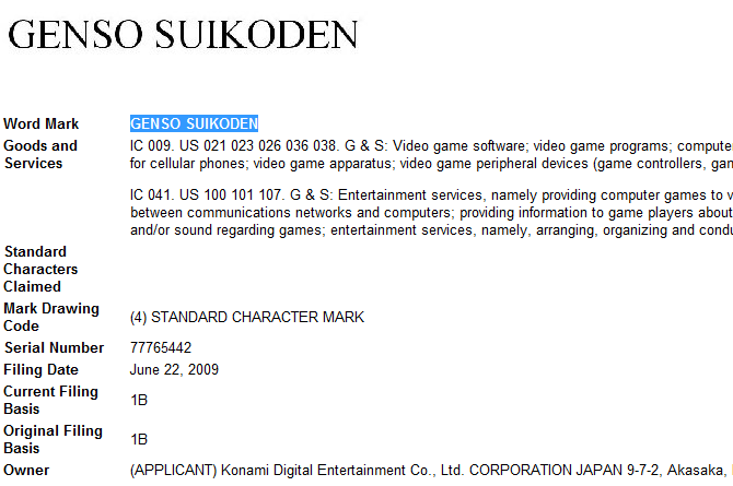A few days ago Konami registered a trademark for Genso Suikoden in the USA (thanks for the tip Pesmerga00!!). The last Suikoden trademark led to a brand new game, but I’m not sure this one will.