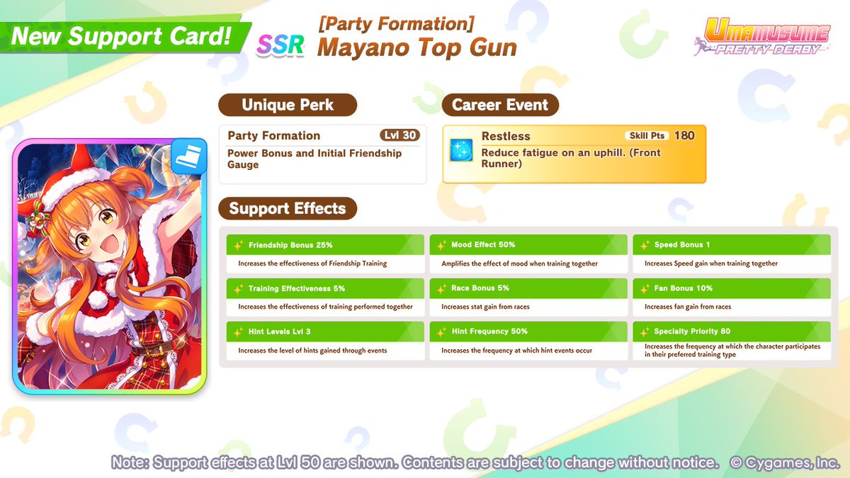 Cygames’ accelerated Umamusume: Pretty Derby global version schedule means the Japanese 2021 Christmas event, Support Cards, and Oguri Cap and Biwa Hayahide Trainee characters are now available worldwide. Their banners and Career Mode activities are now live until January 20, 2026. After all the banners end, the two new SSR cards for Mayano Top Gun and Narita Taishin and the alts for the Cinderella Grey units will join the general pool.