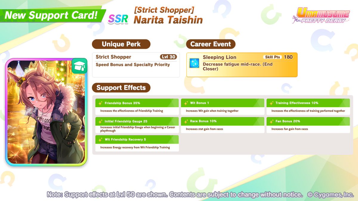 As for the two SSRs, each one’s draw is a Career Event that bestows a Stamina-restoring skill for greater endurance. Mayano Top Gun is a SSR Speed card that includes the Front Runner skill Restless. She also has Specialty Priority. The Wit Narita Taishin SSR gets Sleeping Lion for End Runners. Her Unique Perk adds a Specialty Priority with a Speed Bonus.