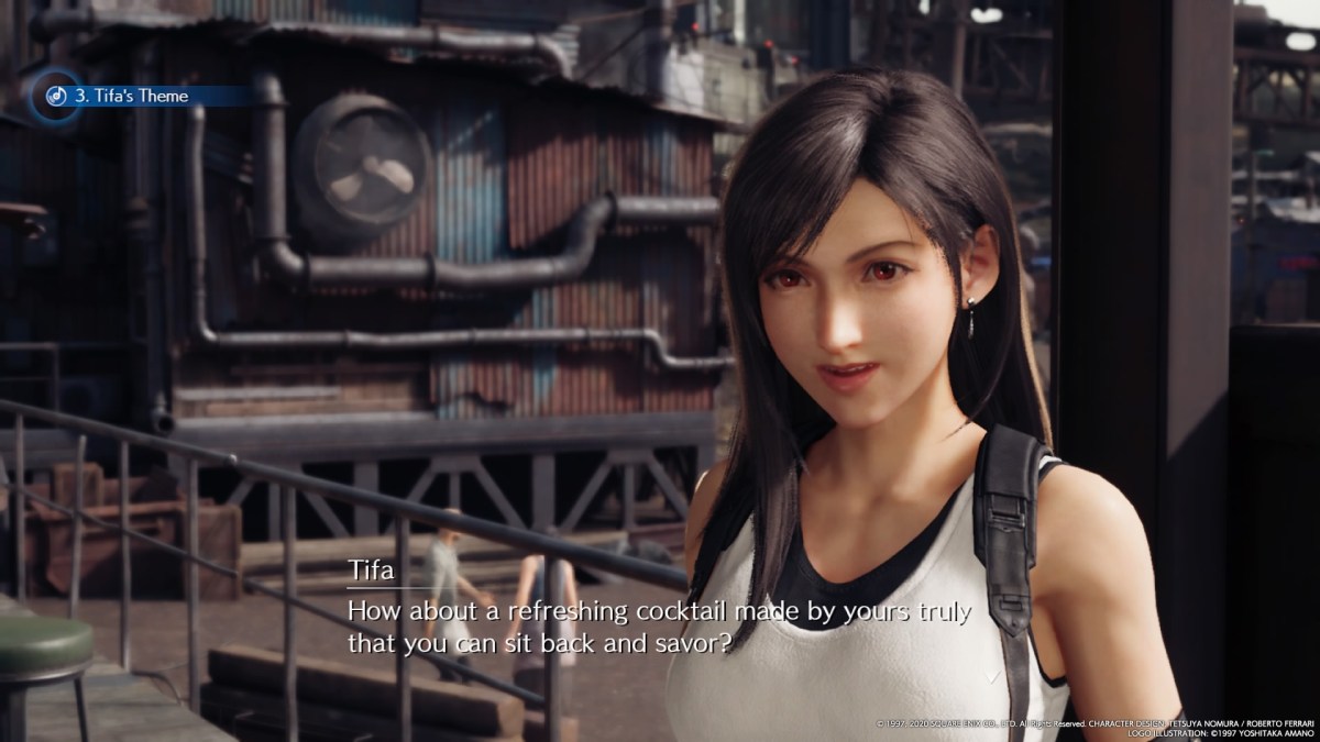 The acting isn’t the only subtle way Tifa’s character and relationships are defined in Final Fantasy VII Remake. What I also love is the sense of space surrounding Cloud and Tifa, and how it parallels the current state of their relationship. Not long after Cloud comes to the Sector 7 Slums and is set up with an apartment by Tifa, we see the two of them in Seventh Heaven together. After a conversation with other members of the group, she takes a seat at the bar, rather than behind it. We see the two of them from the back, one at each side, with this tremendous gap between them.