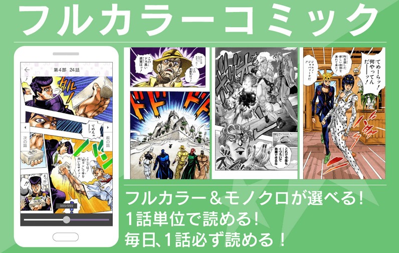 The app has three main features going for it, with the first one being free JoJo manga chapters that will be available to read in black and white or in full-color, and it’ll be free of charge. The app guarantees at least one chapter a day.