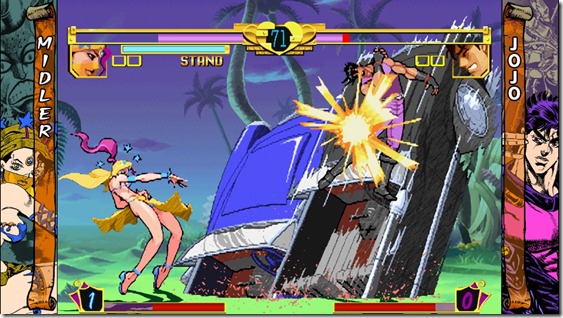In other fighting game playtests, I’ve talked about the ways in which modern fighting games (or rereleases) have all sorts of modes to bring you up to speed with how the game is working mechanically. In JoJo’s Bizarre Adventure HD, there is none of that. No tutorial mode to walk you through how to properly evade or use advancing guards, no “getting to know your stand” feature, and no individual character challenges to teach you combos. You do get a tutorial in the form of a digital manual of sorts, and the game mercifully provides in-game command lists for every character, but outside of that, the learning experience is all on the player. This port feels like it came right out of the Dreamcast era, with only a few concessions to modernity. So, what are those concessions? Well, you get an “HD” mode, which is primarily a single sprite filter (which actually looks quite nice in comparison to other, similar filters), the option to turn blood from the US version’s white to the Japanese version’s red, and the requisite online play. That’s about it. While the port is sparse to say the least, the game itself is a blast. Each character has a “Stand,” (think a ghostly familiar of sorts) which they can activate with a press of the Stand button. While the Stand might make an appearance in a character’s normal or special attacks, a stand changes the way they play completely. Leading man Jotaro Kujo, for instance, has his Light, Medium, and Heavy normals combo into each other more easily when his Stand is active, and he will accompany his Stand as it moves forward with a flurry of punches. When his Stand is not active, he can effectively attack his enemies from both sides by sending his Stand forward with an attack before dodging behind an opponent with L+M+H simultaneously.